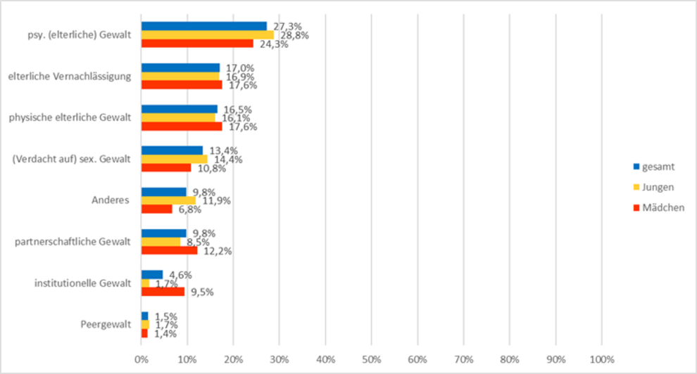 Telefonische Beratungen im KS-Z Hannover: erlebte Gewaltform, geschlechtsspezifisch (Prozentangaben; N=626, Mehrfachnennung möglich)